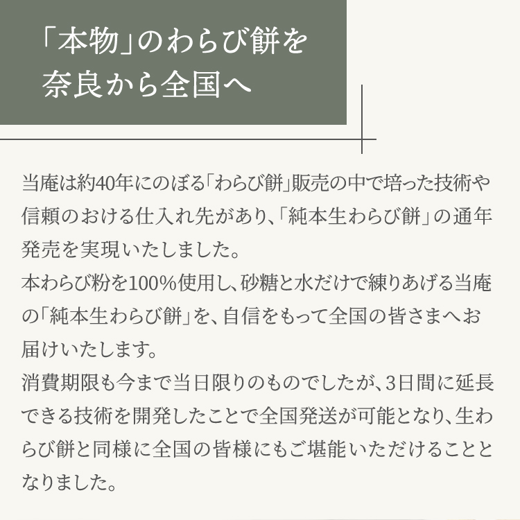 『純本生わらび餅』は、わらび餅の語源である、山菜のわらび(蕨)の根をたたいて砕いて何度も水で晒して乾燥させた、とてもとても希少で高価な国産のでん粉『本わらび粉』を十割(100%)使用し、そこに砂糖と水だけで熟練技術者が練りあげた最上級の本わらび餅です。
