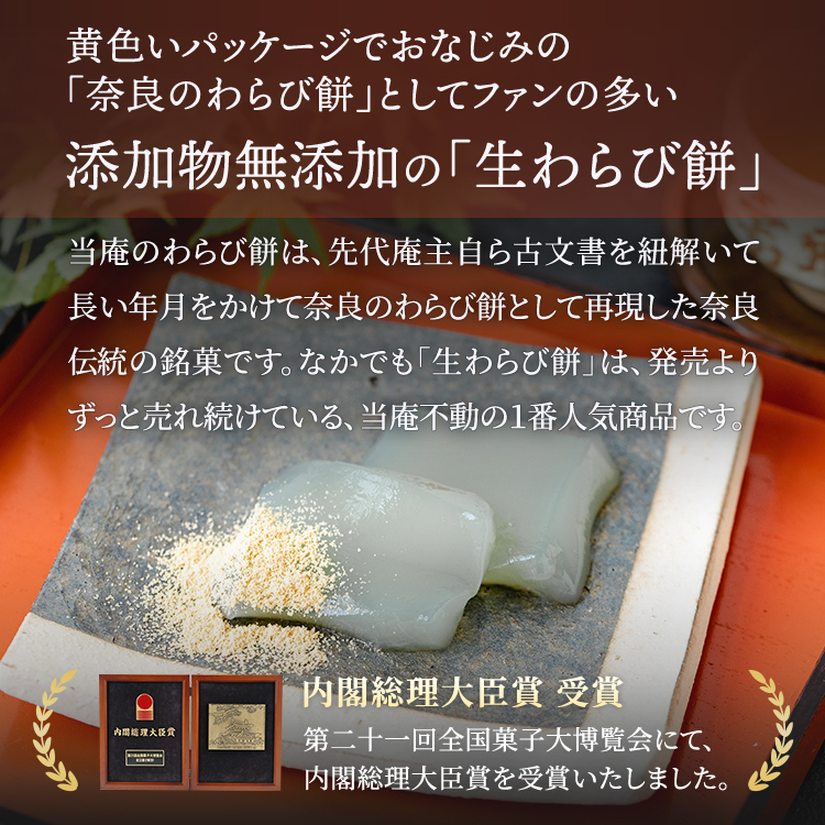 千壽庵吉宗の先代庵主が、古文書をひもといて長い年月を重ね「奈良のわらび餅」として再現させた伝統の銘菓です。