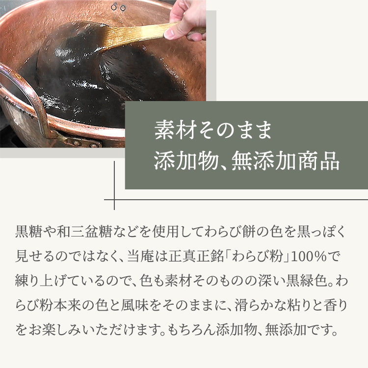 「本わらび粉」と「砂糖」と「水」だけで練りあげるというシンプルだからこそ、ごまかしのないこの味をお楽しみください。