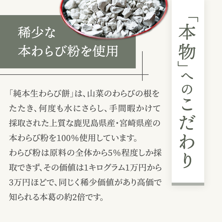 『純本生わらび餅』は、わらび餅の語源である、山菜のわらび(蕨)の根をたたいて砕いて何度も水で晒して乾燥させた、とてもとても希少で高価な国産のでん粉『本わらび粉』を十割(100%)使用し、そこに砂糖と水だけで熟練技術者が練りあげた最上級の本わらび餅です。