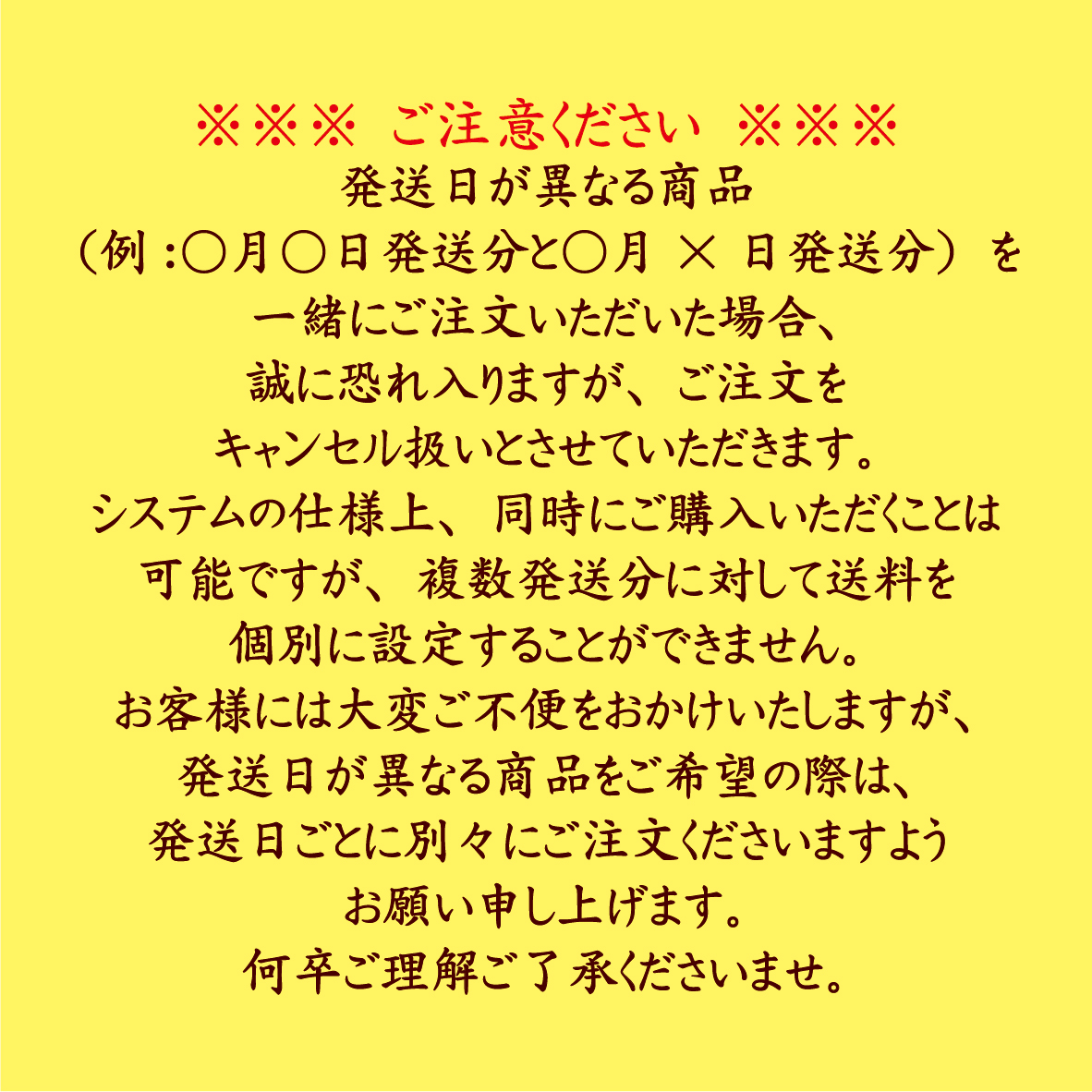 発送日が異なる商品(例:○月○日発送分と○月×日発送分)を一緒にご注文いただいた場合、 複数日分の送料計算が出来ない為、誠に恐れ入りますが、ご注文をキャンセル扱いとさせていただきます。