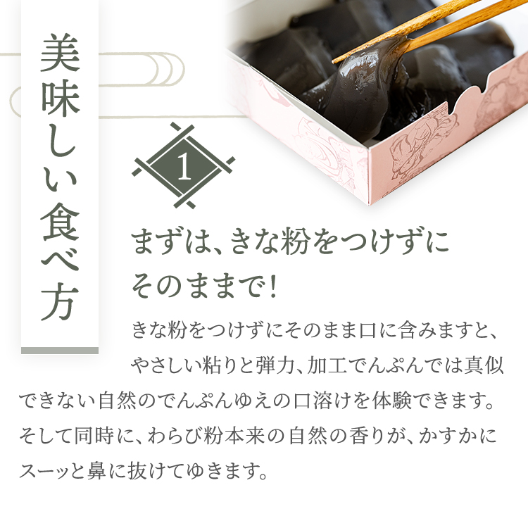 はじめ、わらび餅には何も付けずにそのままでお召し上がりください。次に、きな粉をかけてお召し上がりいただきますと2つのお味を楽しむことができます。