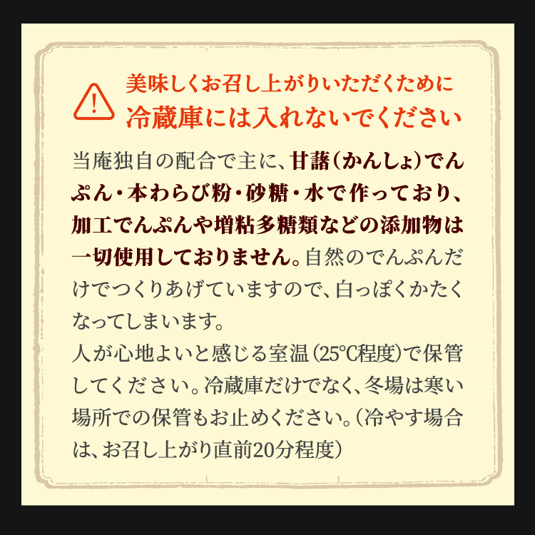 ☆加工でんぷんを一切使用せず、自然の澱粉だけを使用した食品添加物無添加商品のため、冷蔵庫で長時間保管しますと固くなりますのでお止めください。