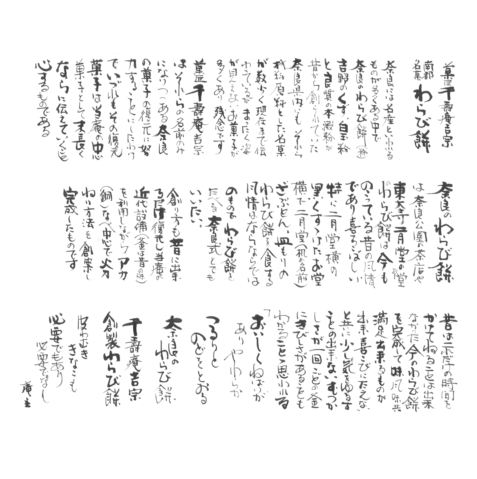 千壽庵吉宗の先代庵主が、古文書をひもといて長い年月を重ね「奈良のわらび餅」として再現させた伝統の銘菓です。